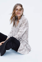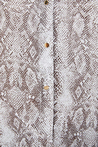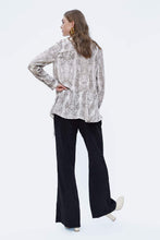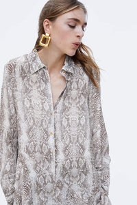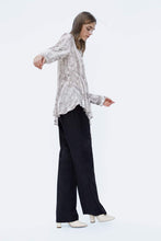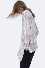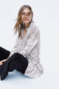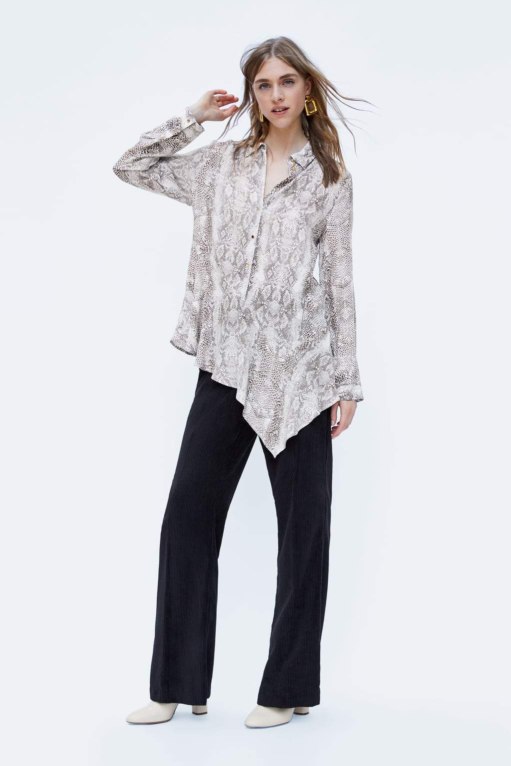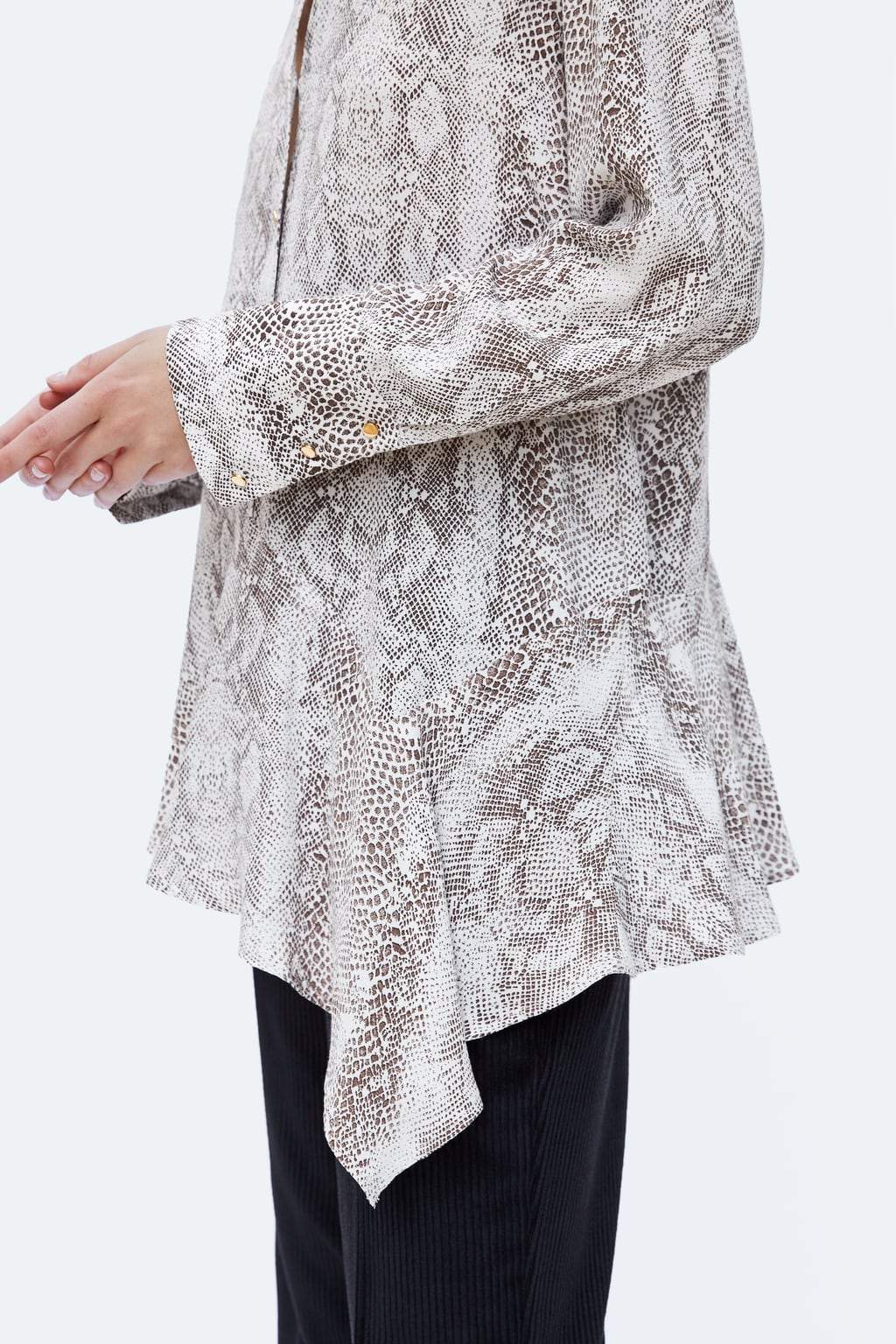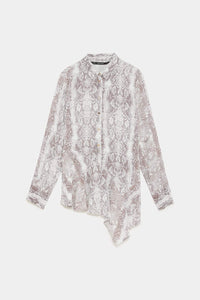 Flowing collared shirt with long sleeves. Featuring an asymmetric ruffled hem and a metal button-up front.