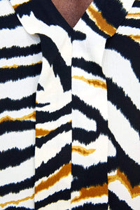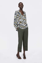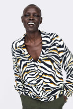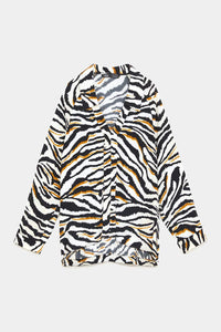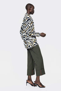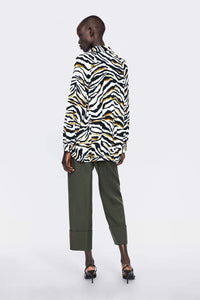 Oversized blouse with a johnny collar and long sleeves. Featuring an asymmetric hem with elasticated detailing in the back.