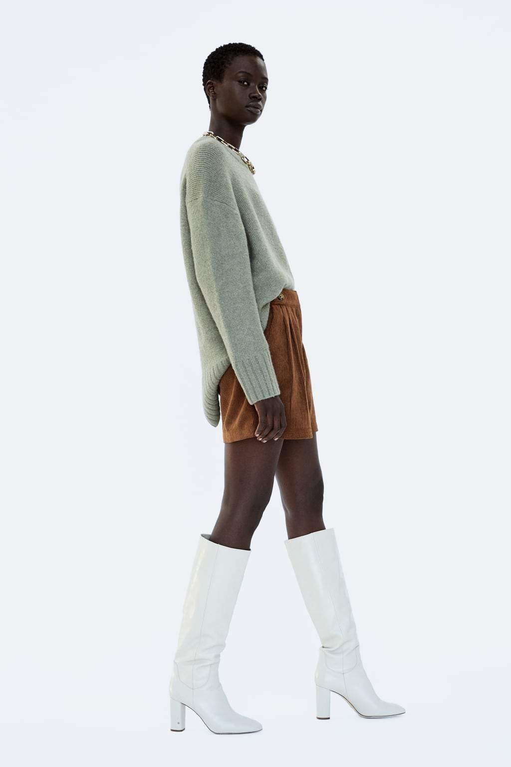 High waist Bermuda shorts with front pleats and decorative contrast buttons. Featuring front pockets, false rear welt pockets and metal zip, inside button and hook fastening in the front.